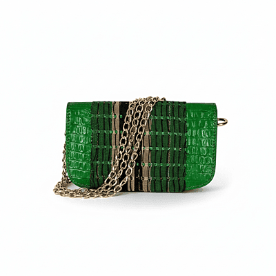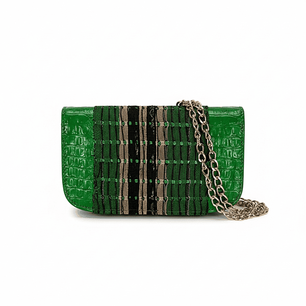 This handmade green leather and Aso Oke bag is crafted in Nigeria by skilled local artisans who blend traditional textiles with premium cowhide leather. The combination of rich green leather and authentic Aso Oke fabric creates a crossbody bag that feels both modern and deeply rooted in African heritage.